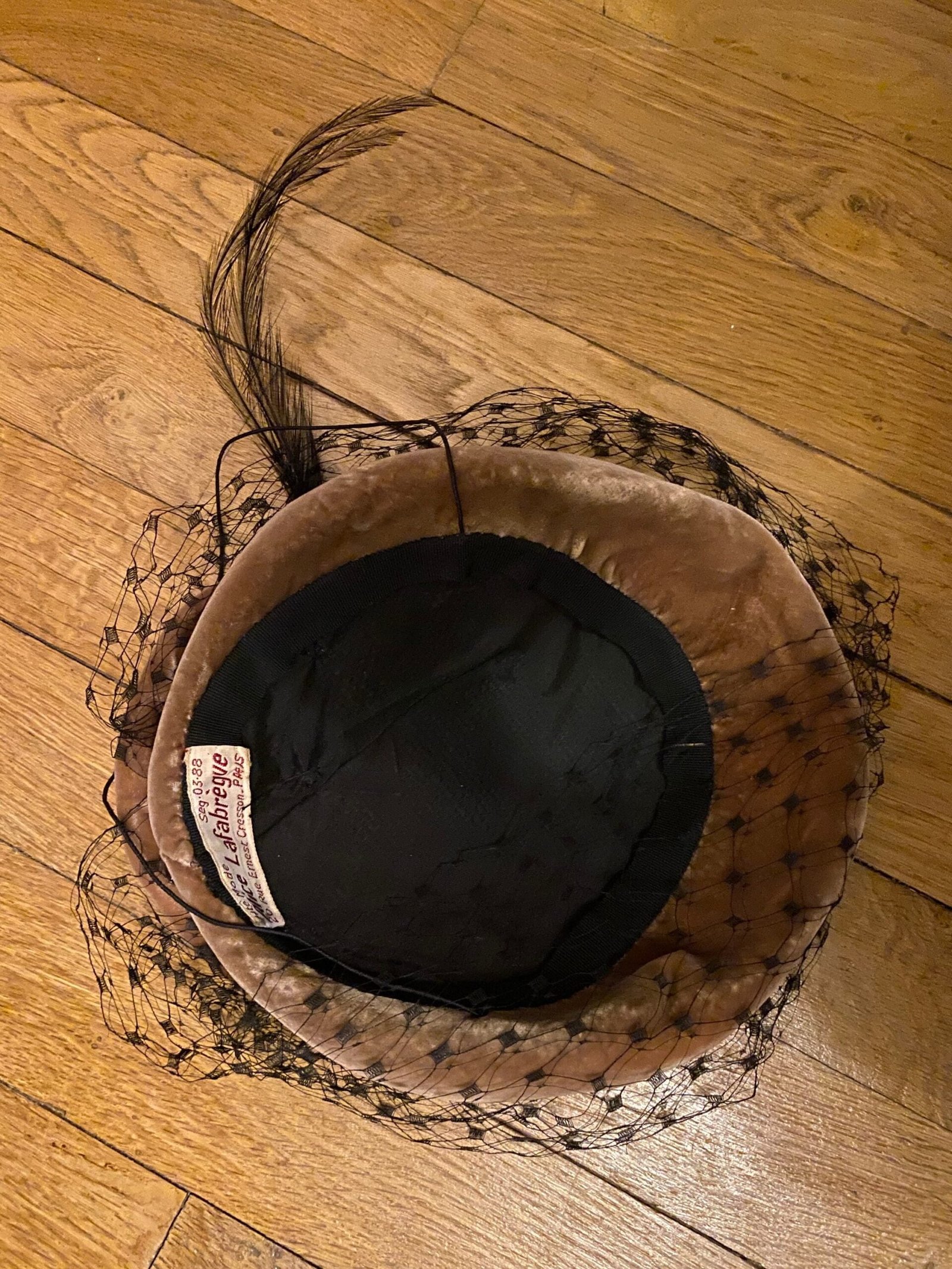 Superbe et très élégant chapeau parisien des années 1930-40 en velour de soie vieux rose, voilette noir et longue plume noir.