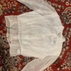 Très beau travail de plissé aux épaules,manches et applications de dentelles, boutons bijoux.