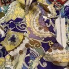 Elle est en satin d’ Acétate , boutonnée sur le cotes gauche , col dit «pelle à tarte » de la maison française «Tricel»