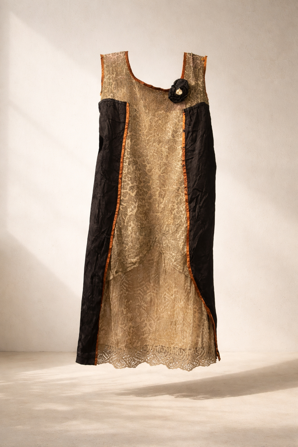 Le panneau central en dentelle beige doré, légèrement transparent, laisse deviner un fond de robe en soie. Il est encadré de larges panneaux de soie noire froissée, soulignés par un galon de satin couleur rouille qui structure la ligne verticale du vêtement. Une fleur textile appliquée à l’épaule apporte une touche décorative caractéristique des robes de l’entre-deux-guerres.